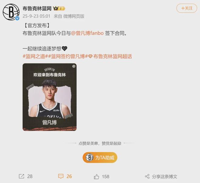 9月23日,布鲁克林篮网于9月23日正式宣布,他正式与中国球员Zeng Fanbo签订了合同,中国球员Zeng Fanbo将穿着12号衬衫。以前,Zeng Fanbo为点火队效力时使用了第12位。他们仍然有双向合同任务,但他们没有与Zeng Fanbo签订双向合同,而是提供了附件10合同。让我介绍10份展览合同。 1。每个团队最多可以注册三个两条合同和六项展览合同。设备的薪水限额都不包括在内。 2。图10中的合同可以转换为双向合同,但必须在常规赛开始之前完成。 3。只有奖金本身就包含在本身中,而没有任何其他奖励。有两项合同的球员将为下个赛季支付636,000美元。我可以为10次份额签订合同?如果Zeng Fanbo被切断并加入了开发联盟网络的团队,STays 60天,您将获得附件10 $ 5,000至85,300美元之间的合同奖金。它明显低于两道合同! 10月10日和10月12日,北京时间,Net和Sands将在澳门进行两场NBA比赛,Zeng Fanbo将确认他们的首次亮相。一些球迷推测:篮网是否只会给Zeng Fanbo签订附件10的合同来出售门票?这当然是可能的。但是,就小郑而言,他仍然必须努力赢得双向合同。今年8月初,Zeng Fanbo去了美国进行特殊培训,并于9月初参加了净训练营。 Nets的教练组对Zeng Fanbo的表现非常满意,并且是最后一次双向篮网合同的受欢迎人士。 2024年9月,Net授予Cui Yongxi的双向合同。 2024年12月,Cui Xiao笑了他的左膝前交叉韧带,被一个网络。 Zeng Fanbo于2003年1月11日出生。他场均得到14.7分,4.7个篮板,1.9助攻,1个注册.5盖帽,在三场比赛中进行射击(52.6%,40.5%,79.8%)。在今年的季后赛中,Zeng Fanbo场均得到15分,4.2个篮板,1个援助和1.6个盖帽,其中3个射击率的56.3%,43.3%和61.5%。我们希望小敏能够保留球队并进入常规的NBA赛季。来吧,Zeng Fanbo!