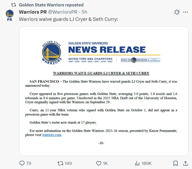 北京时间10月19日,勇士队官方宣布裁掉LJ克莱尔和塞斯库里。此举将使勇士队的阵容恢复到14+3,因为L.J.克莱尔和塞斯库里都有训练营合同。克莱尔为勇士队打了5场季前赛,场均上场9.6分钟,得到5分、1.8次助攻和1.6个篮板(今年落选)。库里的弟弟塞斯没有参加季前赛。赛斯(Seth),又名小库里(Curry Jr.),今年 35 岁了。 NBA记者Marc Stein随后跟进报道称,正如上文所述,勇士队在裁掉塞斯后,计划在球队有足够薪金空间的情况下在下个月重新签下他。那是因为勇士队交易库明加后,球队只有200万美元的空间,无法以一名老将的底薪签下库里。他必须拥有至少 229.6 万美元的薪金空间。勇士队试图利用日常转换决定重新签下塞斯。他们首先给了他一个tra与他签订了训练营合同,然后在常规赛开始前释放了他。大约两周后,工资将降至200万日元的标准。重新签下小库里后,勇士的15+3阵容将确定:库里、巴特勒、追梦者、库明加、穆迪、希尔德、博德姆斯基、桑托斯、戴维斯、波斯特、霍福德、佩顿、梅尔顿、理查德、塞斯。 Rowe、Toohey、Spencer(三个来回)。这样的阵容我们真的能赢吗?这个阵容有九名后卫:库里、小佩顿、塞斯、斯宾塞、波德姆斯基、穆迪、希尔德、理查德和梅尔顿。勇士队有7名33岁以上的球员:库里、霍福德、希尔德、巴特勒、追梦者、塞斯和佩顿。说实话,这个阵容又短又老。阿林 快船队的击球技术很古老,但是很高。勇士队的阵容确实很短。