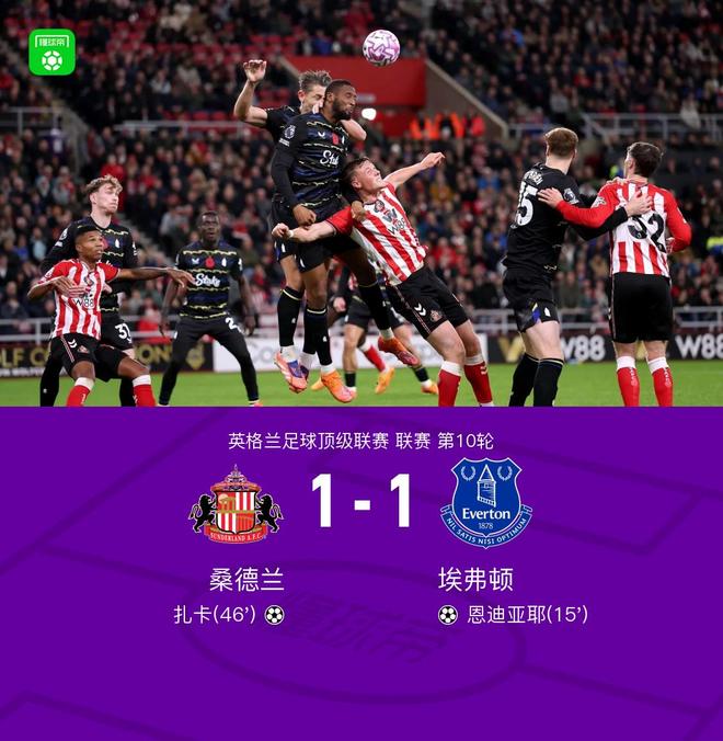 北京时间11月4日,英超第10轮比赛,桑德兰主场迎战埃弗顿。比赛中,埃弗顿队的恩迪亚耶首开纪录,帮助客队取得领先。桑德兰换边后,扎卡在鲁法伊的助攻下扳平比分。最终,两队握手言和,1-1战平。关键比赛第15分钟,恩迪亚耶连过三名球员,并从一个角度将球踢出。埃弗顿 1-0 桑德兰(米格) 看看英超联赛吧。第46分钟,勒法耶传球,扎卡低射破门扳平比分。观看英超联赛桑德兰 1-1 埃弗顿 (米格) 的独家精彩集锦。两队球员均入场。比赛立即在场上开始。第15分钟,恩迪亚伊横过三名球员,角度将球踢出。埃弗顿1-0桑德兰。第17分钟,萨迪基犯规,主裁判向他出示黄牌。第28分钟,格拉R伊施禁区左侧斜传,巴里射门高出。第32分钟,巴里拉倒萨迪基,裁判向他出示黄牌。第46分钟,鲁法伊传球偏出,扎卡高出球门低射扳平比分。桑德兰1-1埃弗顿 英超第54分钟,休姆对格拉利什犯规,裁判向其出示黄牌。英超比赛第87分钟,格拉利什用肩膀甩开防守球员。左侧传中被门将没收。