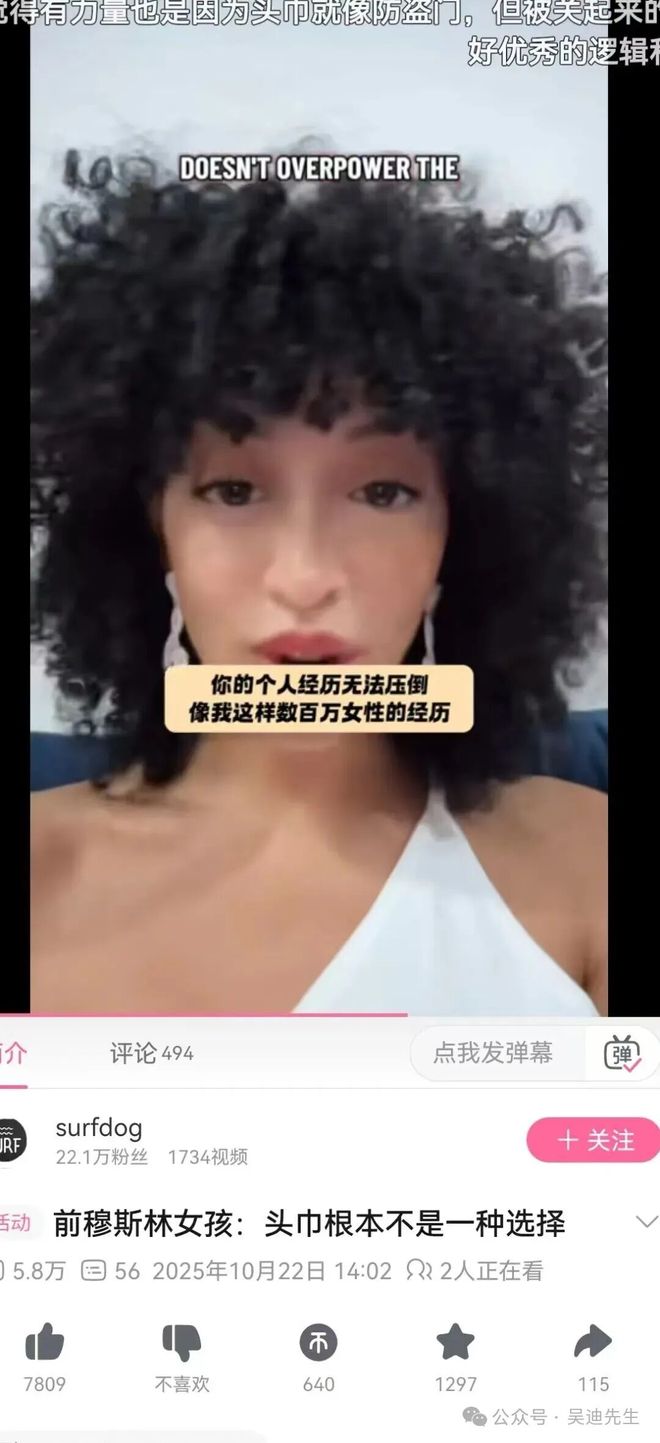 在哔哩哔哩,一位前穆斯林冲浪者分享了她对头巾的看法。因为他有亲身经历,理解很深,所以他的话很好:简单易懂,感人至深。我个人的感受值得与大家分享。 ! ! Surfdog是bilibili平台知名UP主播,专注于创作生活类内容。她的视频涵盖多种主题,注重跨文化比较、分析社会热点、分享有趣的生活故事。今天我将分享您对视频的看法。不戴头巾的穆斯林妇女应该停止捍卫头巾。每天,不戴头巾的穆斯林妇女都会在我的视频下面的评论部分捍卫头巾。显然,你从未被迫戴头巾。因此,您对需要/应该/必须戴头巾的支持只是简单地站起来并在不伤害背部的情况下讲话即可。 “你的头发很吸引男人,所以你应该把它遮起来。”你的人生经历不会暴露在这个如果你听到这句话,你将无法理解对他说这句话的人。由您的家人决定给您穿什么。政府决定把什么东西放进你的身体里。社会决定你应该携带什么。不戴头巾但主张戴头巾的穆斯林女性一直认为选择戴头巾是她们可以戴或不戴、或根本不戴的“选择”。这就是我们所说的特权。对于伊朗、阿富汗和沙特阿拉伯的数百万女性来说,戴头巾既不是一种选择,也不是个人自由;而是一种选择。这是一项法律义务。类似的个体现象在西方国家也存在。在父母都是伊斯兰极端分子的家庭中,女儿别无选择,只能被迫戴面纱。戴头巾对于穆斯林妇女来说被认为是一种荣誉。是的,如果您居住在上述国家之一:伊朗、阿富汗或沙特阿拉伯,这适用于您。它实际上涉及惩罚者来自政府和家庭。手帕既不是文化产品,也不是装饰品,而是一座人造监狱。我厌倦了为头巾辩护的争论,仿佛它只是道德谦卑的象征。 “保守主义是女性气质之美。” “她很漂亮,但她隐藏起来,以免勾引男人。”大话。如果一位女士试图摘下围巾,她会被忽视。他们遭到殴打、监禁、被排除在家人之外,有时甚至被杀害。如果她们足够幸运,避免被监禁、流落街头或被谋杀,她们将被迫嫁给一个特定的男人。您选择戴头巾是因为它赋予您力量,这是您的个人选择,您有权做出决定,我为您感到高兴。仅仅因为头巾对你个人来说意味着力量,并不意味着它对数百万其他女性来说不是压迫。您的个人经历并不比数百万像我这样的女性更好。生活在这些国家的女性甚至不允许拿起手机、录制视频或创建此类内容。违反禁忌会导致死亡。宗教国家会毫不犹豫地杀害敢于发声的女性。在阿富汗,妇女在公共场合讲话是违法的。还有人捍卫围巾!作为“头巾制度”的支持者,何不尝试戴头巾呢?这是一个让我真正困惑的问题。为什么你如此热衷于捍卫头巾却又不想戴它?答案是因为我们不想承认我们的特权。当你从未被迫佩戴头巾时,捍卫它就像告诉一个一生都在挨饿的人,他们有幸能够吃喝而不必担心食物,并且饮食可以赋予你力量。这是侮辱性的。我们必须利用您的声音和平台来捍卫所有女性的权利和自由。女性有选择戴头巾的权利和自由,女性有选择戴头巾的权利和自由。建议不要戴头巾。不幸的是,政府对这个问题进行了干预。因此,最重要的是,提高妇女自由的声音,有必要捍卫头巾。成为一个真正理性的女权主义者,就要为那些没有发言权的女性挺身而出。这就是团结的意义,就是赋予其他妇女权力和提升其他妇女的意义。请停止批评我选择不戴头巾的视频,因为您所捍卫的头巾不是您自己想要戴的东西。感谢我们的忠实读者 Jasmine 对本文的翻译和合作。作者简介:吴迪,某地基层干部。发货邮箱: