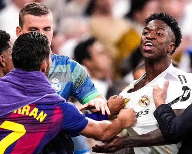 西班牙精英赛于北京时间10月27日举行。皇马2-1击败巴塞罗那,赢得25亿欧元的对决。比赛结束后,两队球员发生了激烈的冲突。裁判很忙,一共出示了1张红牌和6张黄牌!这场经典赛非常令人兴奋,主要有以下三个原因。 1、皇马上赛季对阵巴萨四连败,球队渴望复仇。 2、皇马仅落后巴萨两分,如果输球将失去第一名。 3、亚马尔挑衅皇马。这三个原因中,第三个是最重要的。多家西班牙媒体公开表示,亚马尔已经成功激怒了皇马球员。比赛开始的时候,所有皇马球员都显得震惊不已,认为自己要为亚马尔的傲慢付出代价。最终皇马2-1拿下比赛,但亚马尔整场比赛并没有发挥积极作用。当裁判吹响f之后终场哨响,皇马队长卡瓦哈尔走近亚马尔。赛前,西方媒体透露卡瓦哈尔想采访亚马尔,直接表达对自己行为的不满。据《马卡报》报道,卡瓦哈尔告诉亚马尔:“如果你说得太多,今天你就吞下你的愤怒。”亚马尔一听这话,立刻勃然大怒,大骂卡瓦哈尔。随后,冲突升级,队友们纷纷被碾压。目测,有三十多人参与冲突,维尼修斯、库尔图瓦等人都相当兴奋。赛后裁判报告显示,共有七名球员在冲突中受到黄牌警告。皇马替补门将卢宁因情绪激动地离开替补席并走向对方替补席而被红牌罚下。维尼修斯在替补席上与对手对峙并吃到黄牌。费兰、巴尔德、费尔明、罗德里戈和米利唐因赛后继续在场上与对手对抗而领到黄牌。冲突期间,亚马尔告诉皇马球员:“我有勇气一对一地战斗。”值得注意的是,挑战是口头的。但他却不断后退,最终率先逃走。亚马尔挑衅维尼修斯后,真想打他,却被工作人员制止了。